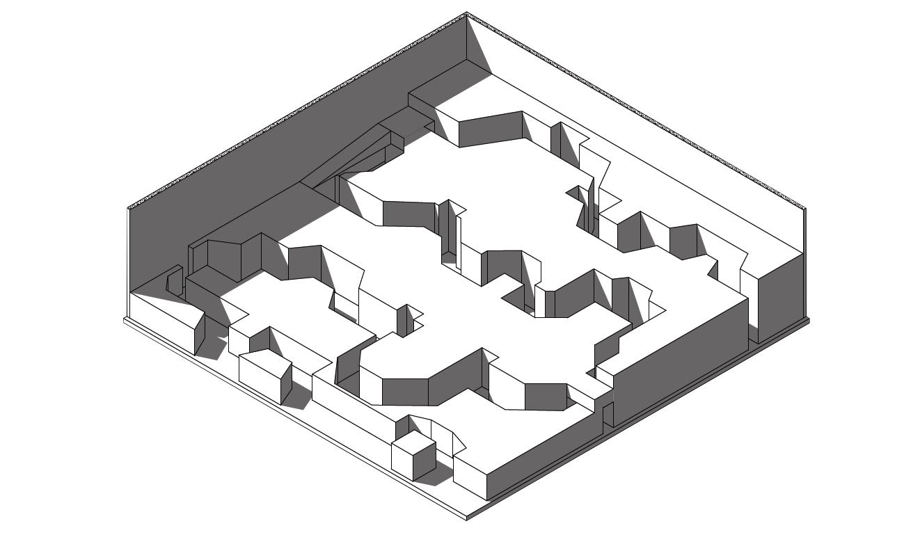Nous avons choisi de traduire cette tension par une architecture brutale, inspirée du brutalisme : béton nu, masses rigides, formes massives et sans compromis. L’espace devient bunker, tranchée, abri : à la fois protection et suffocation.